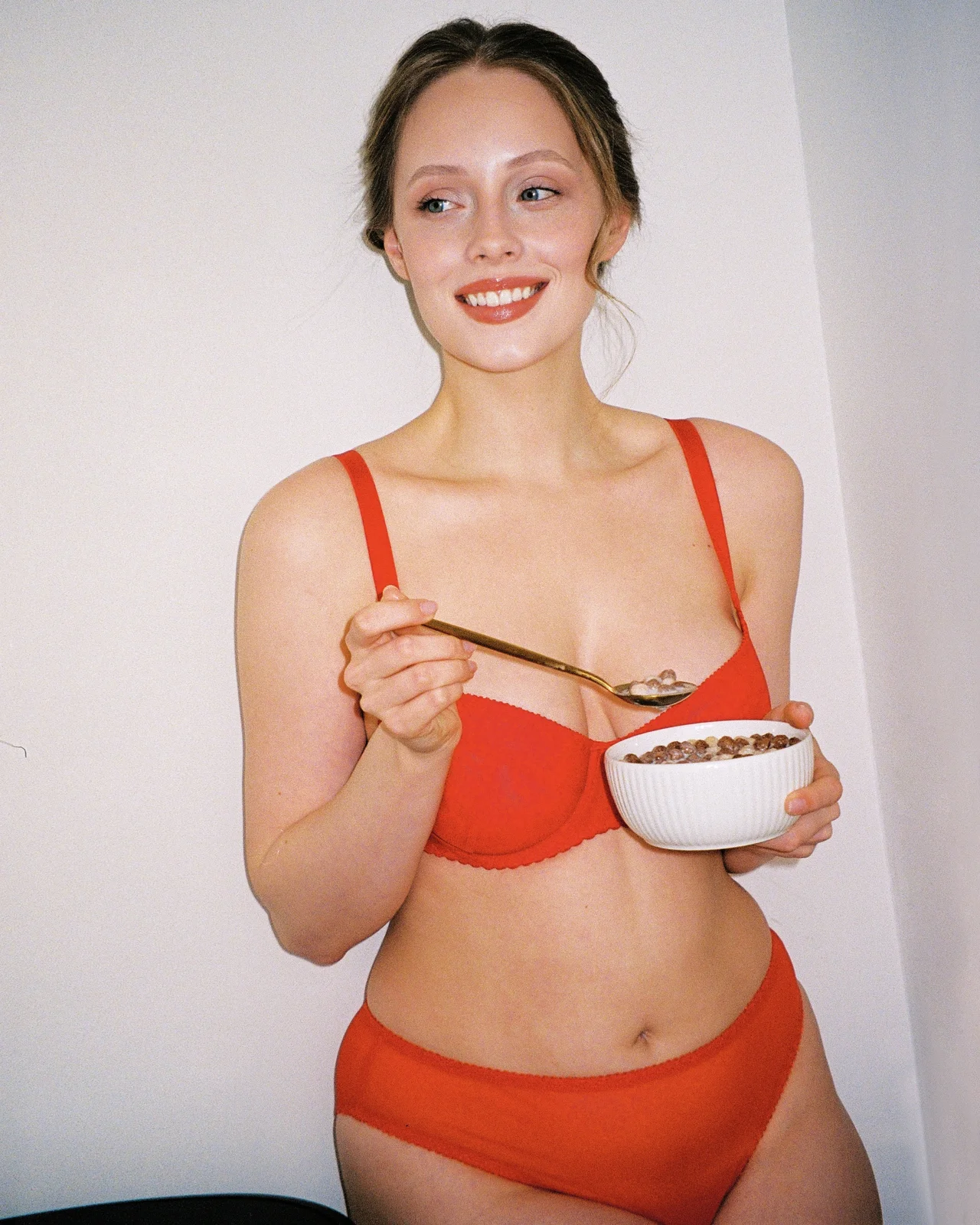 Т-образная чашка с подкладом с широкими бретелями из сетки в красном цвете с высокими стрингами